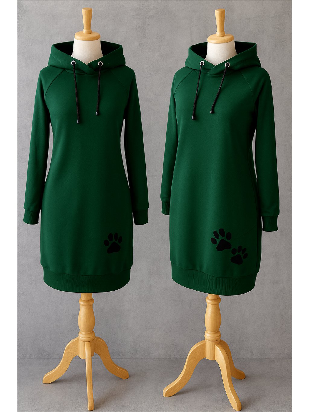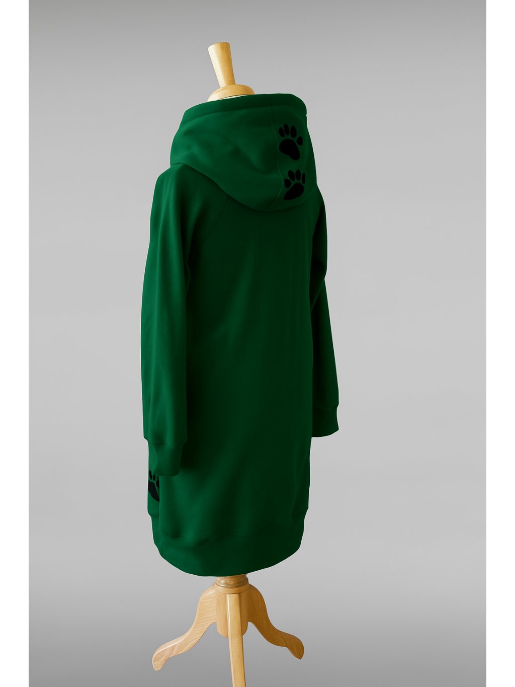 Šaty raglánového střihu jsou ušité z elastické teplákoviny v nádherné tmavě zelené barvě s aplikacemi tlapek.