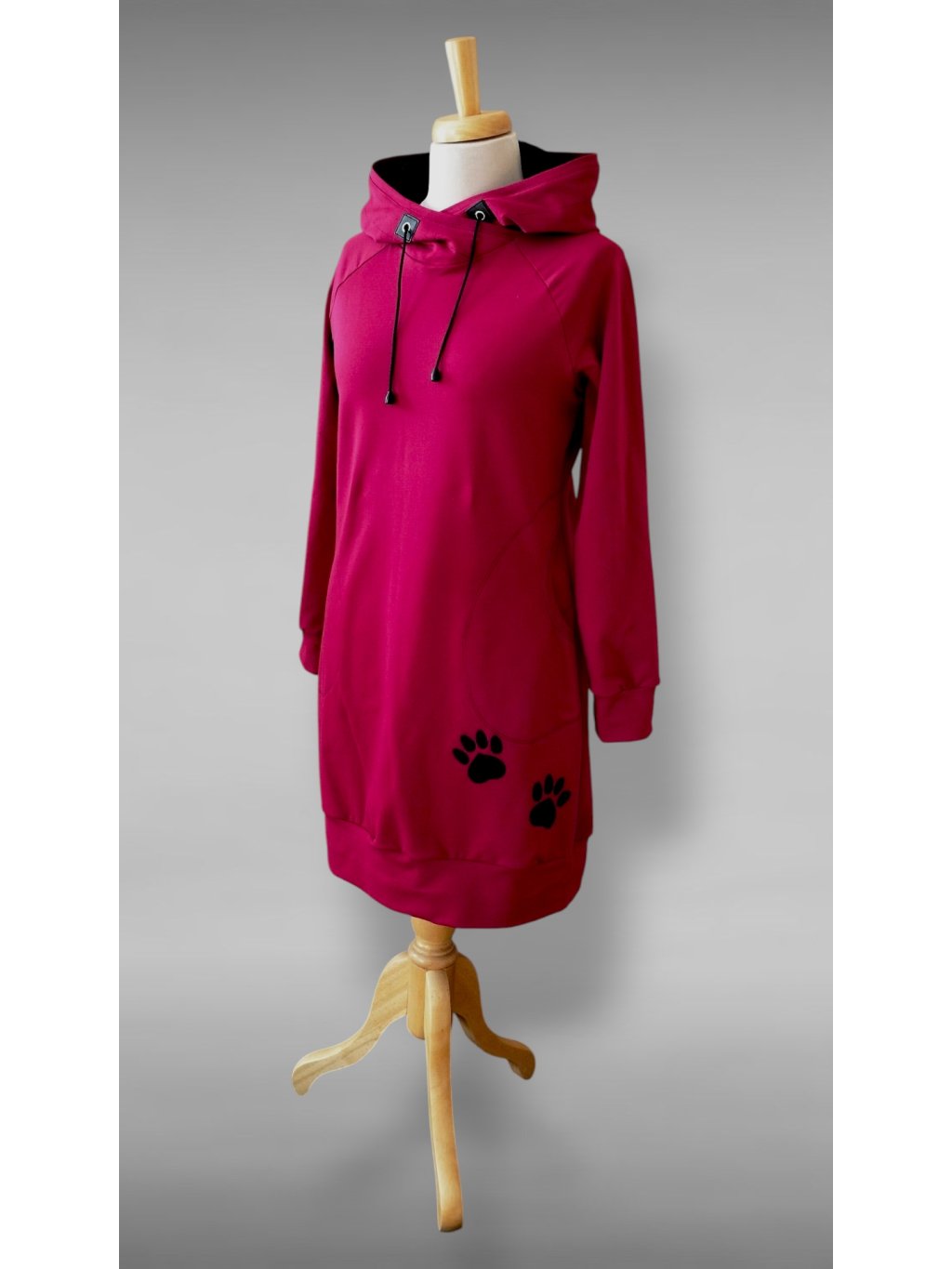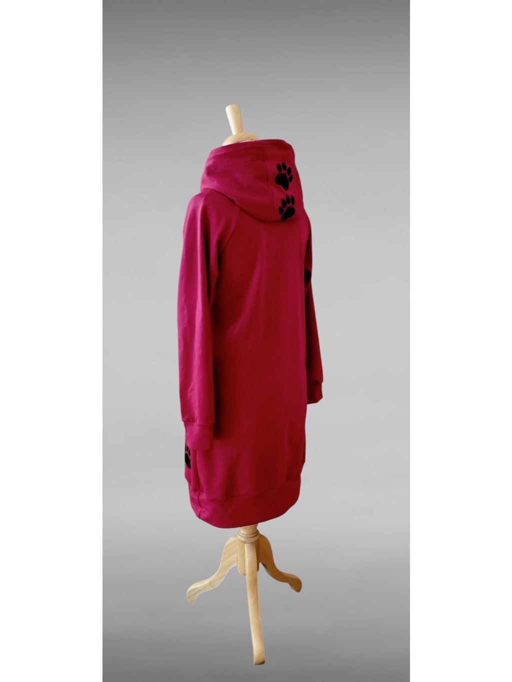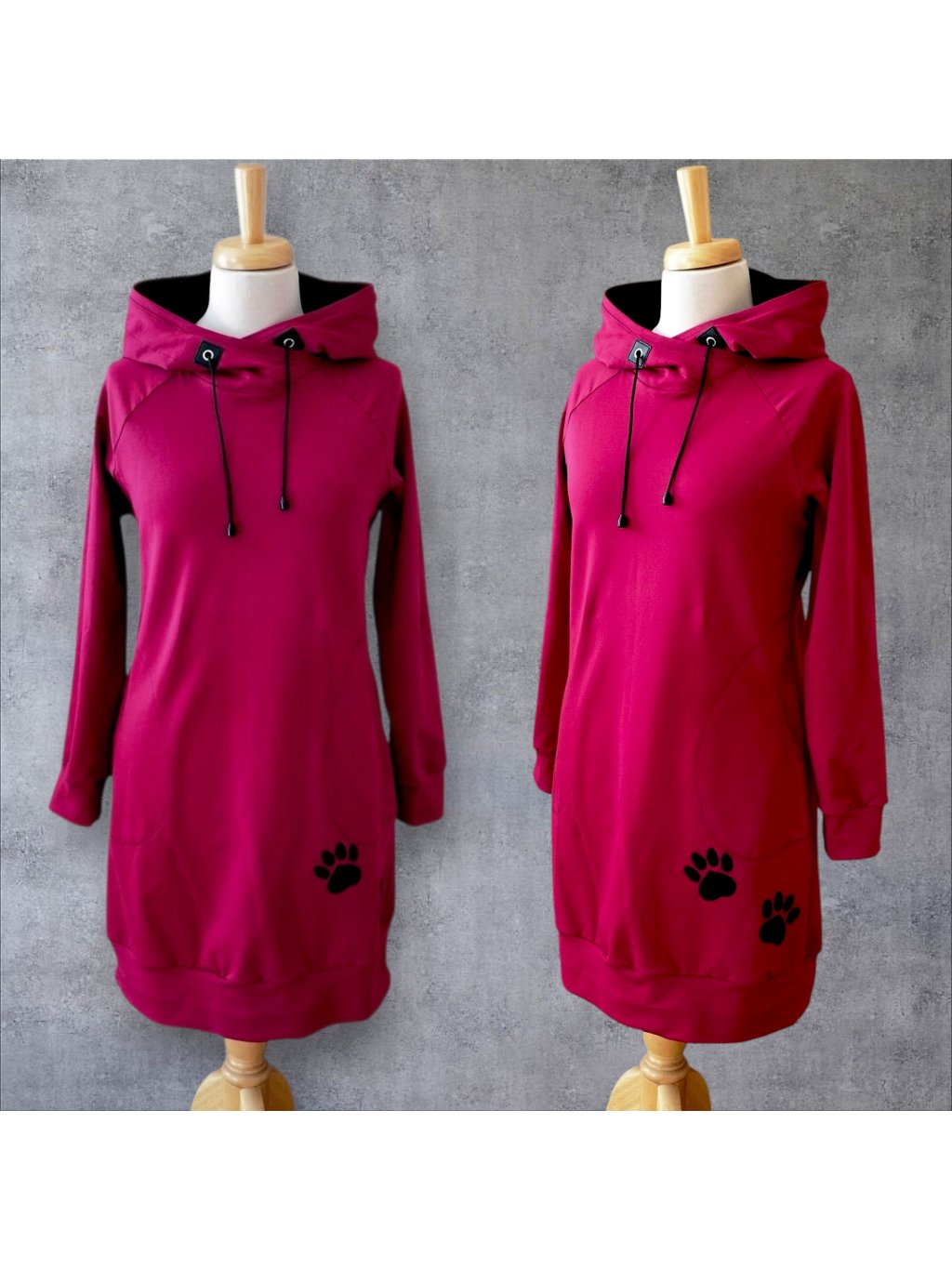 Šaty raglánového střihu jsou ušité z elastické teplákoviny v oblíbené vínové barvě s aplikacemi tlapek.