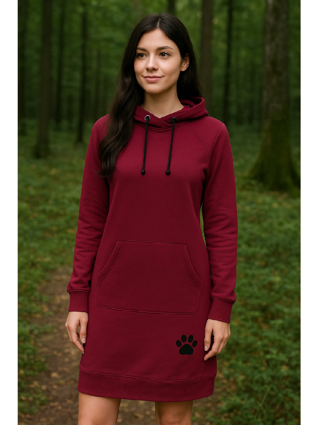 Šaty raglánového střihu jsou ušité z elastické teplákoviny v oblíbené vínové barvě s aplikacemi tlapek.