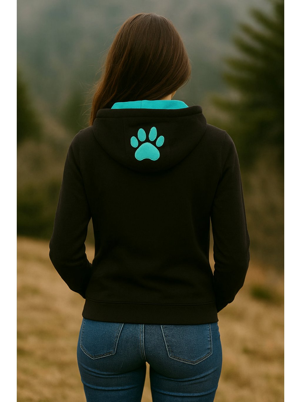 Černá mikina v kombinaci s barvou zelenkavé mint má na předním díle aplikaci velké tlapky a kapsu klokanku. Zadní díl mikiny je celý černý, jedná tlapka je i na kapuci.