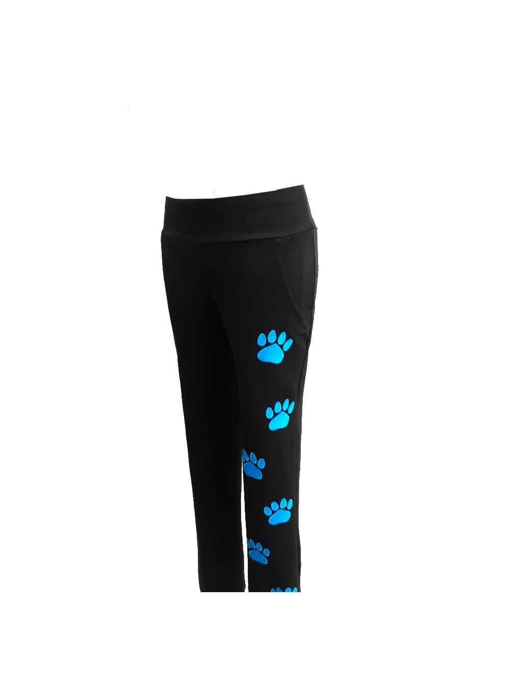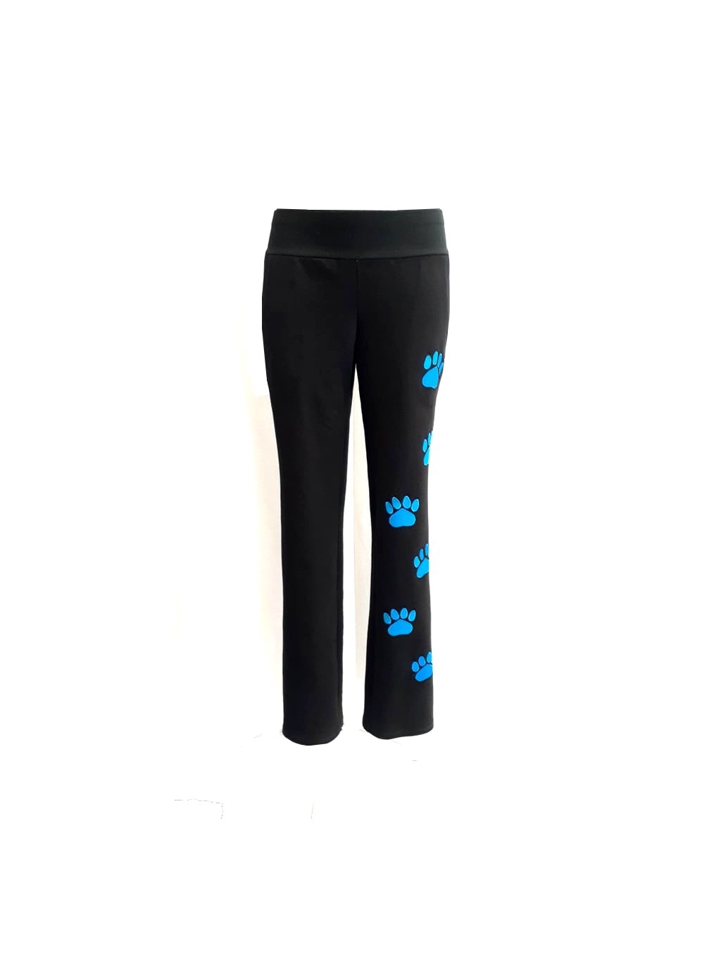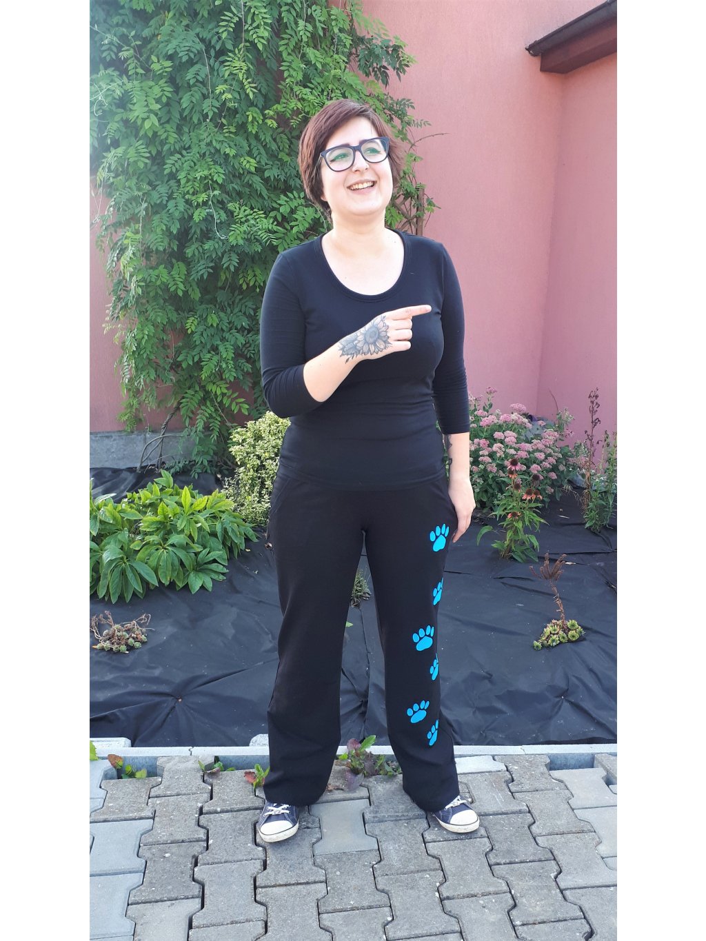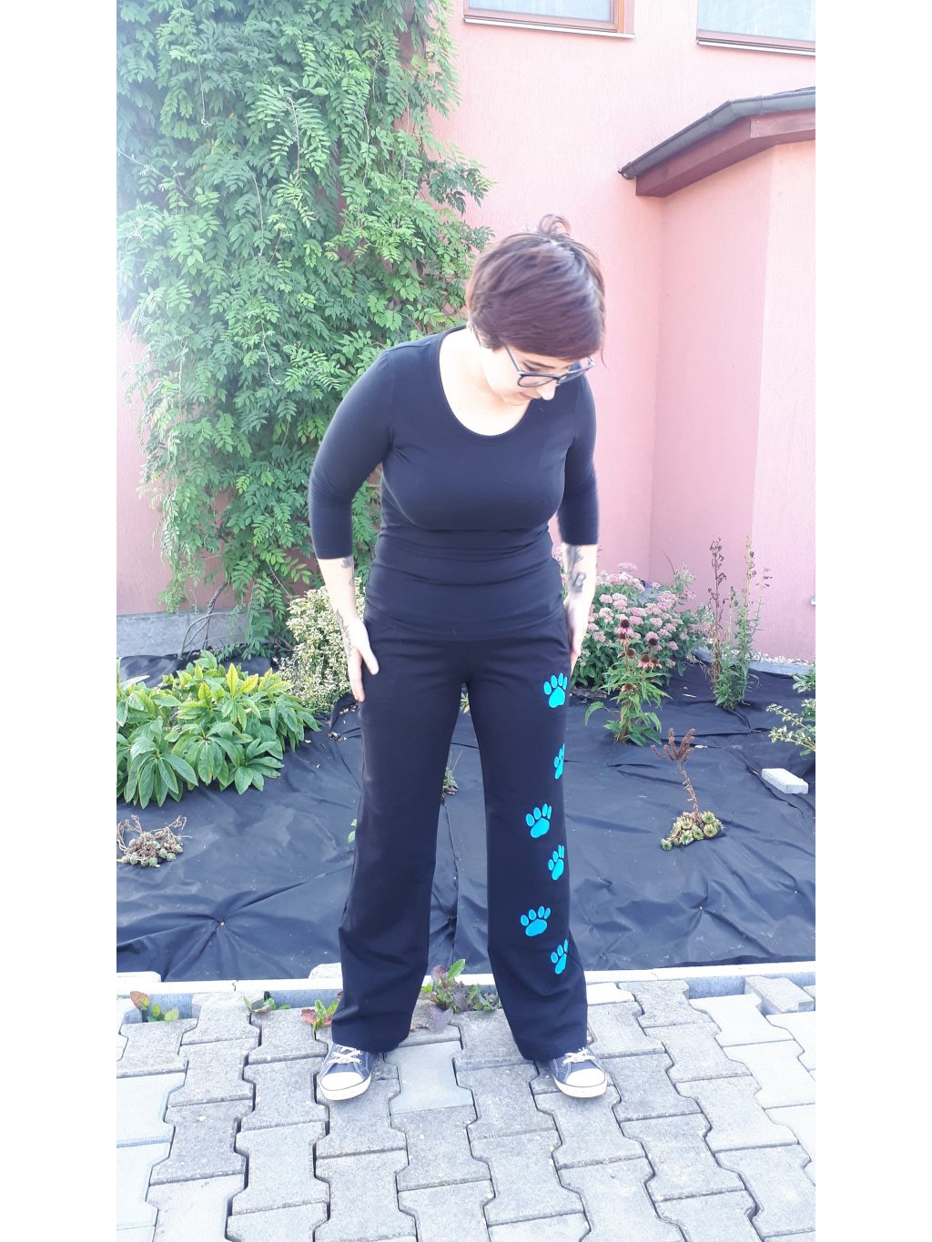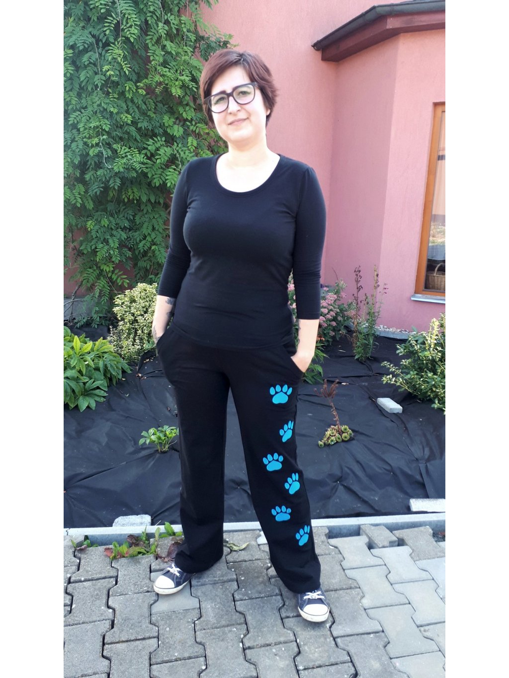 Dámské tepláky rovného střihu s tyrkys tlapkami..