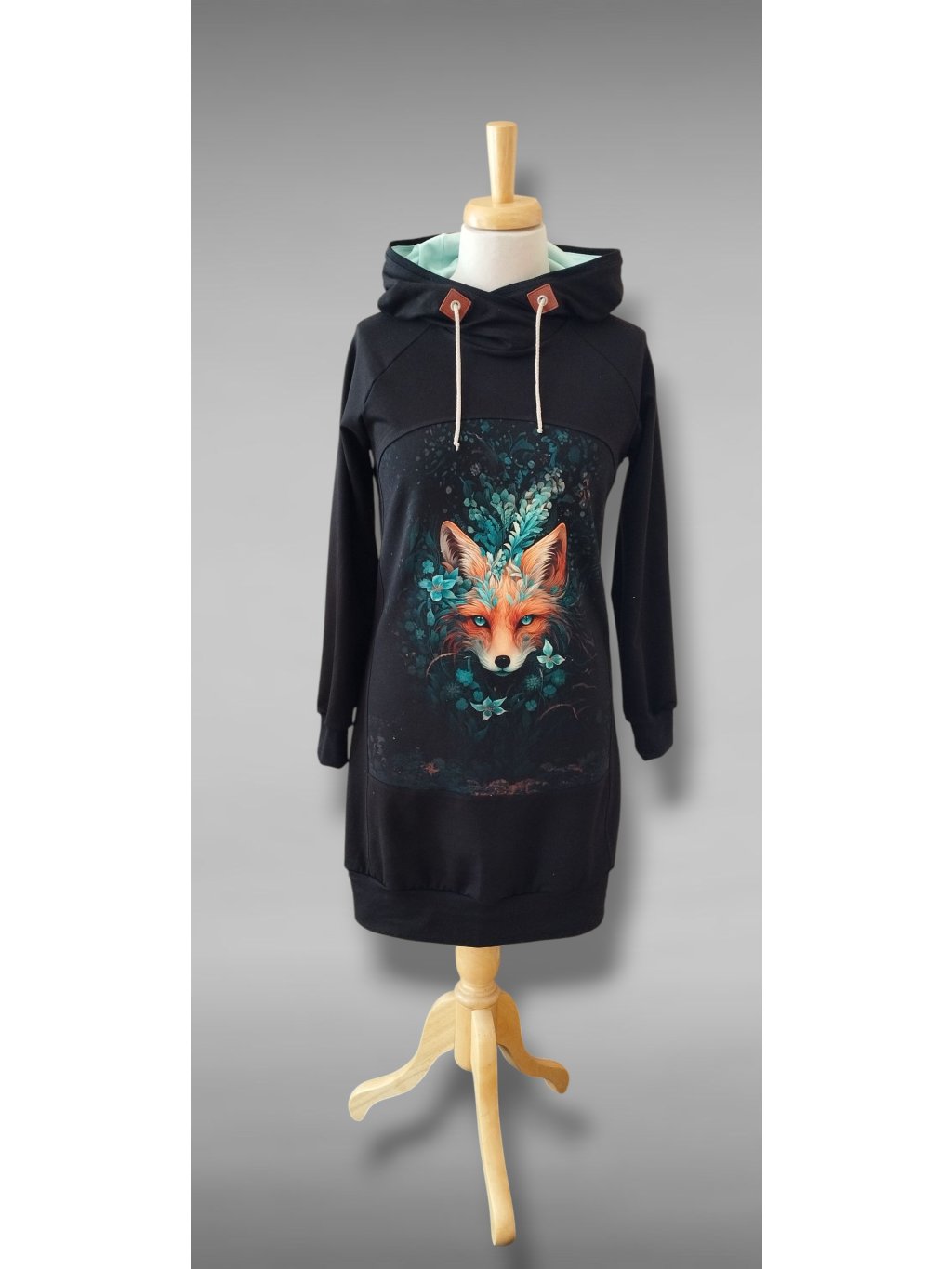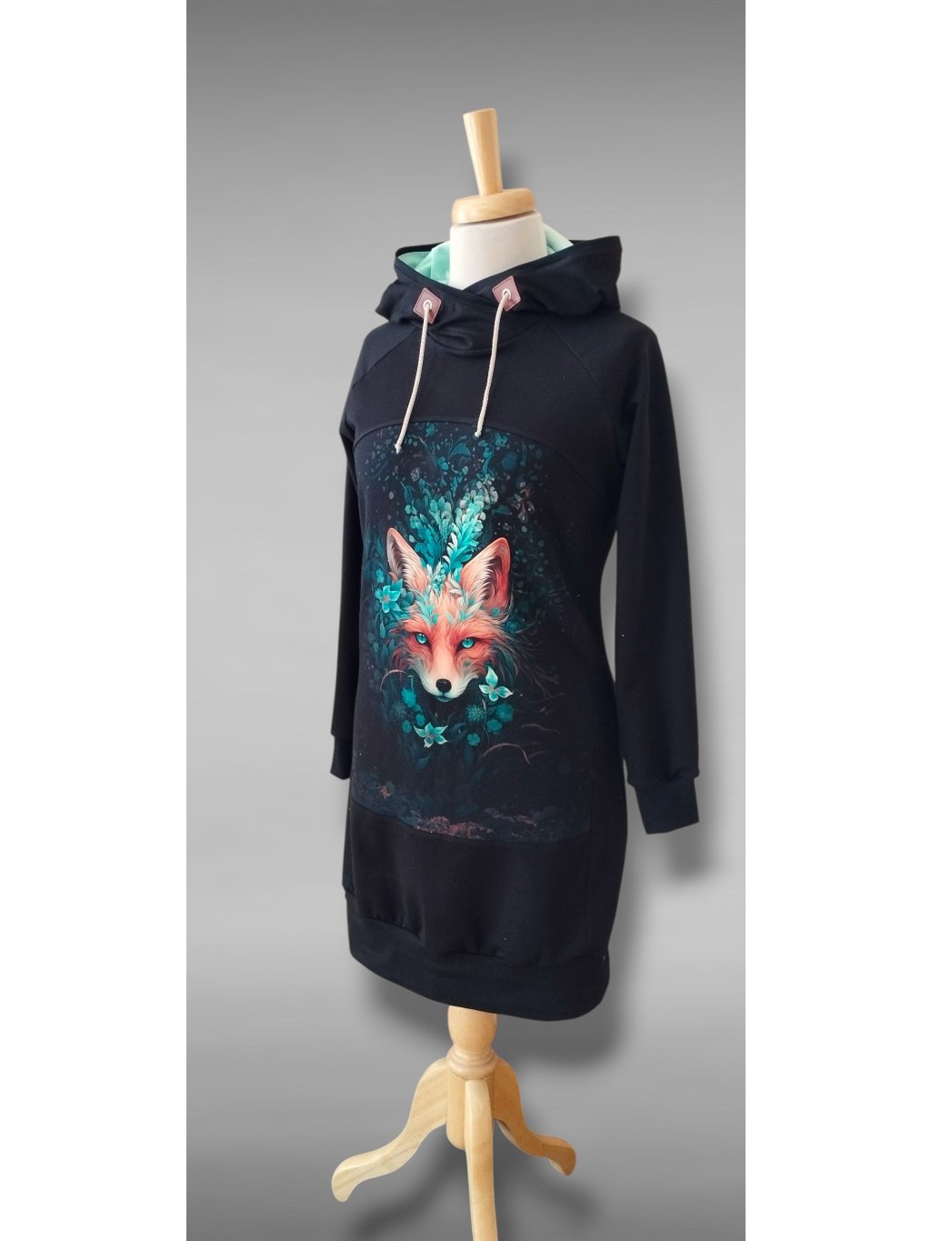 Šaty jsou šité z elastické bavlněné teplákoviny, na předním díle je digitální potisk motivu lišky.