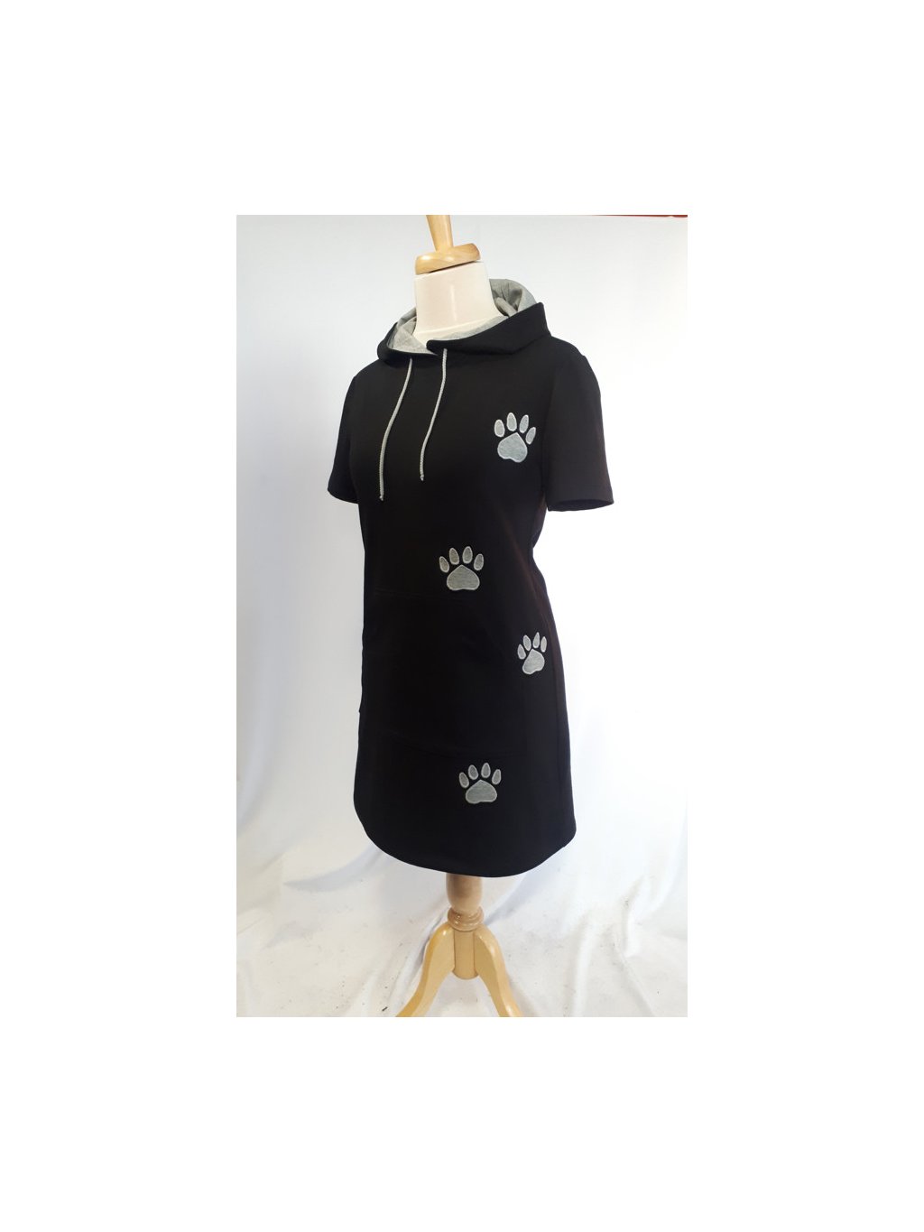Šatovka s kapucí je ušita z elastické teplákoviny (česká výroba), má na předním díle aplikace psích tlapek a kapsu "klokanku". Zádní díl je celý černý, vnitřek kapuce je šedý ,stejně jako tlapky .