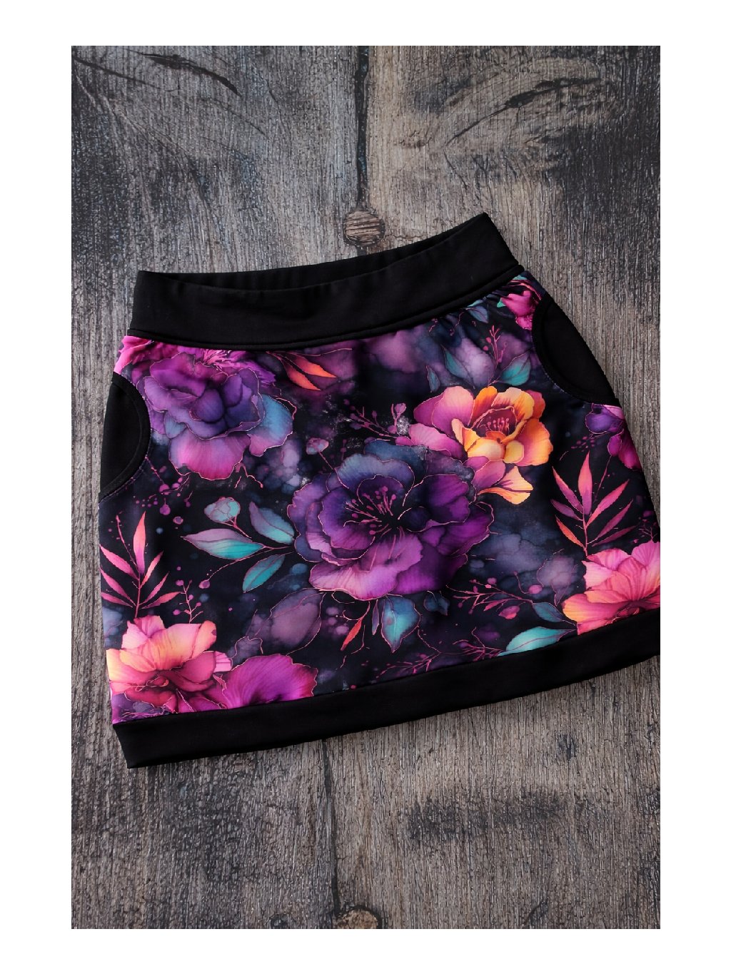 Sukně je ušitá z elastické teplákoviny s digitálním potiskem.